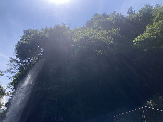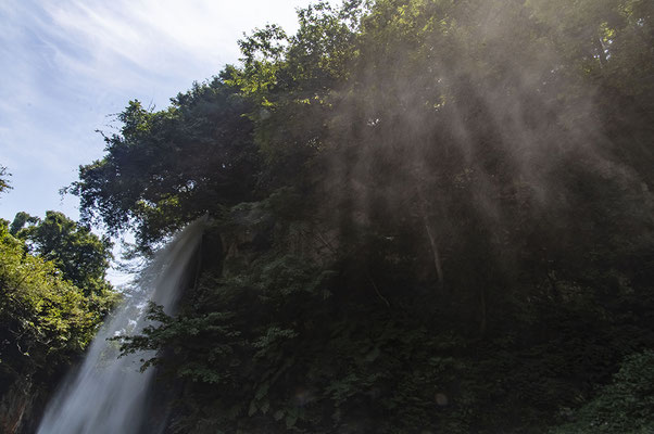 滝の横に水しぶきが舞い、光りが差し込んで時折光芒が出たりして幻想感がありました。