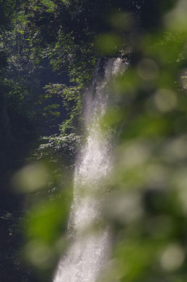 3カット目は望遠レンズ(600ミリ相当)で手前の葉を前ボケにして滝の一部を撮影したものです。