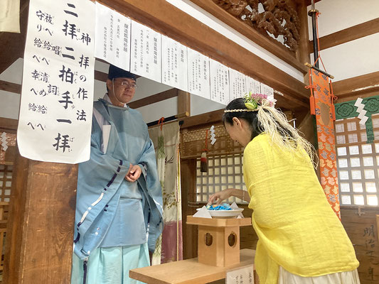 神楽殿のイベントの前に本殿にて参加メンバーによる正式参拝と写真作品の奉納の儀が執り行われました。